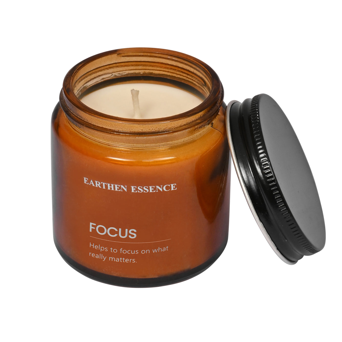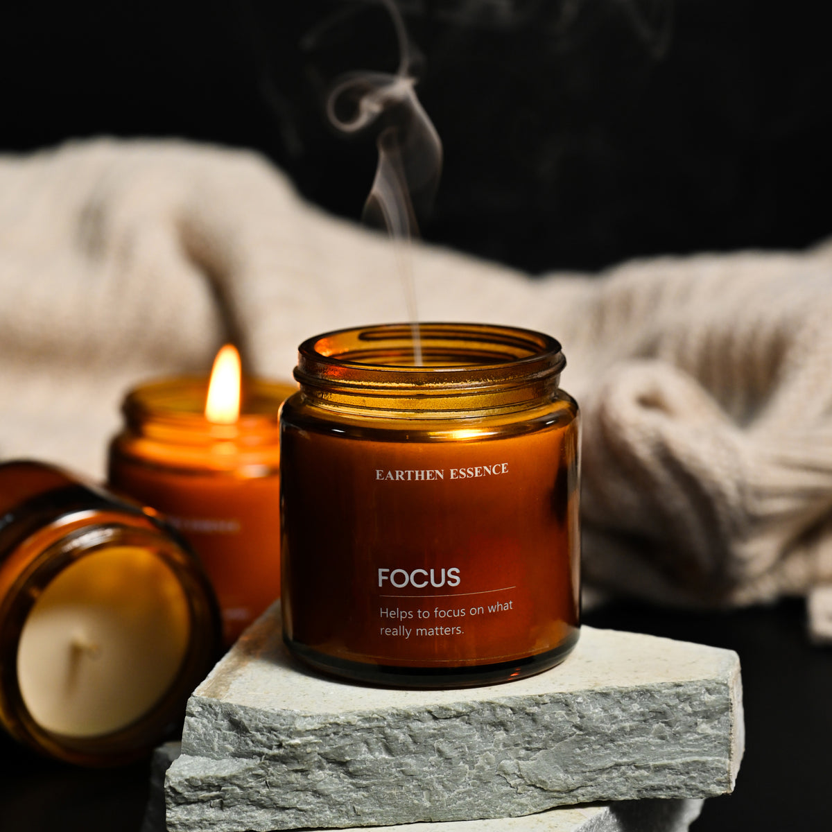 Focus aromatherapy candle helps you concentrate and focus on important things in life. The enticing fusion of Ylang ylang, Peppermint, Lavender, Vetiver, Cedarwood essential oils turns out to be therapeutic as it helps in removing distractions. The Focus aromatherapy oil helps in enhancing and improving concentration. It enables the mind to focus more clearly. If you are finding it hard to concentrate while studying or while working, then this oil is perfect for you!